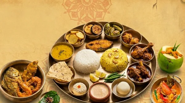 Bhaat, Polao, Dal, Paanch Rokom Bhaja, Fish Fry (1 pc), Salad, Choice of Fish – 1 pc (Katla, Pomfret, Chingri), Chicken Kosha (2 pcs), Mutton Kosha (2 pcs), Chutney, Papad, Sandesh (1 pc), Rosogolla (1 pc), Mishti Doi, Mishti Paan.