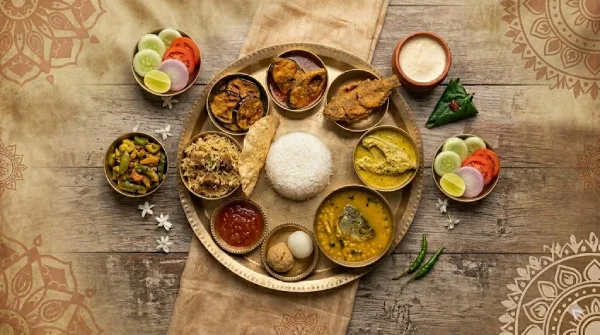 Bhaat, Polao, Dal, Paanch Rokom Bhaja, Salad, Fish Fry (1 pc), Katla Kalia (1 pc), Chutney, Papad, Sandesh (1 pc), Rosogolla (1 pc), Mishti Doi, Mishti Paan.